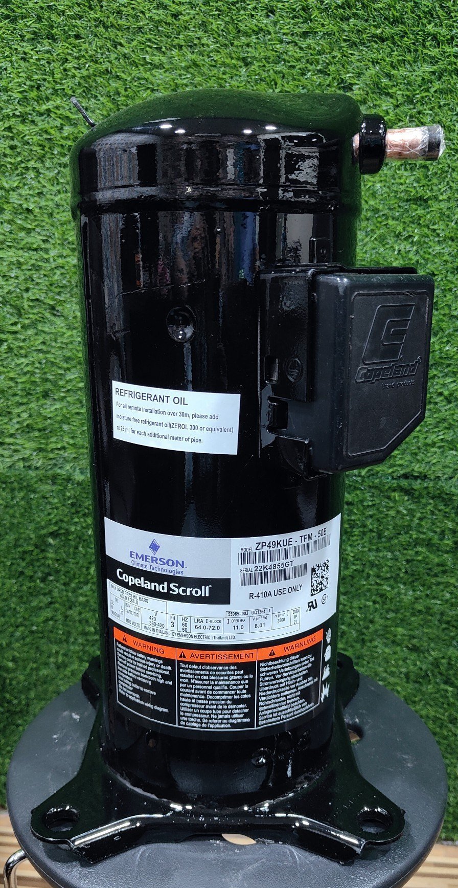 The Emerson Copeland ZP49KUE-TFM-50E is a high-performance scroll compressor designed for air conditioning and refrigeration applications. It operates with R-410A refrigerant, offering excellent cooling efficiency. With a displacement of 8.01 cubic inches per revolution and a speed of 2900 RPM, it ensures optimal performance. The compressor runs on 3-phase power (380-420V, 50Hz) and features thermal protection for enhanced durability. It has a sturdy, black protective casing and a four-point mounting base for easy installation. The low noise and vibration levels make it ideal for commercial and residential HVAC systems. It provides high energy efficiency, reducing power consumption. The reliable design ensures long-lasting performance with minimal maintenance.